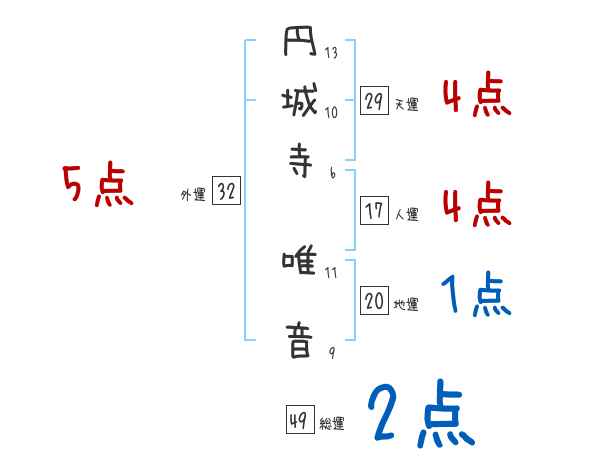 外運![]() | 円城寺唯音さんの外運は32画の5つ星!柔軟性があり成功する。チャンスが多く金運が良い。 生活面を象徴する運勢です。外部から受ける影響力を表し、結婚運、家庭運や職場、環境への順応性を表します。 |