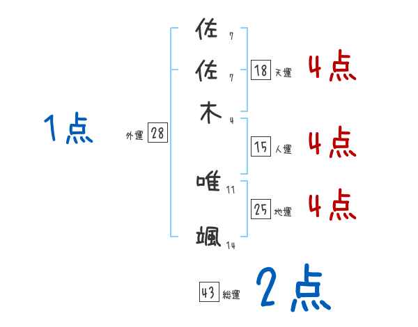 総運![]() | 佐佐木唯颯さんの総運は43画の2つ星!頑固な性格で独立心が強いかも。やや非現実的で浪費に注意しましょう。 あなたの人生を表す1番重要な運勢です。生涯を通じて影響する総合運となり、主に50歳以降の晩年期に影響を及ぼします。 |