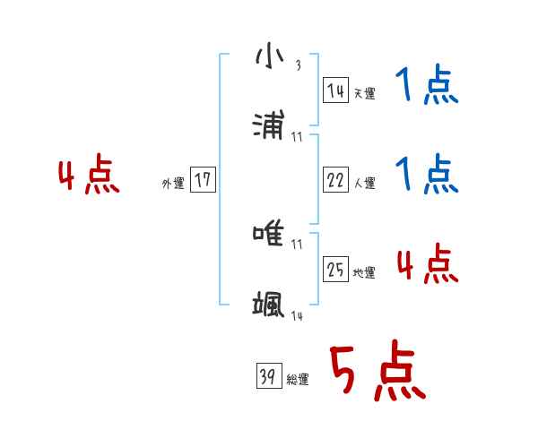天運![]() | 小浦唯颯さんの天運は14画の1つ星!人に対して優しいがストレスを溜め込みがち。人間関係のトラブルを避けるよう気をつけましょう。 家系が持つ宿命的な運勢を表します。祖先から受け継いだ苗字ですので自分の力が及びません。家柄を象徴します。 |
