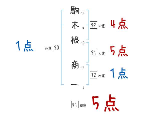 人運![]() | 駒木根商一さんの人運は21画の5つ星!統率力がある。独立し成功する。名誉を手に入れる。 性格や才能などを表す2番目に重要な運勢です。人間関係や協調性、社会的な成功に影響します。主に20歳から50歳ぐらいまでの中年期の運勢を表します。 |