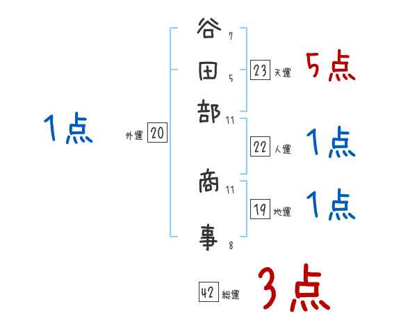 総運![]() | 谷田部商事さんの総運は42画の3つ星!病気に注意。多芸であるが消極的でおとなしい。 あなたの人生を表す1番重要な運勢です。生涯を通じて影響する総合運となり、主に50歳以降の晩年期に影響を及ぼします。 |