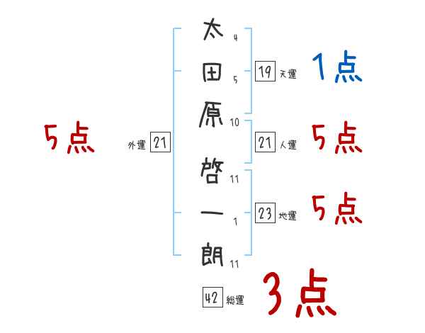 外運![]() | 太田原啓一朗さんの外運は21画の5つ星!統率力がある。独立し成功する。名誉を手に入れる。 生活面を象徴する運勢です。外部から受ける影響力を表し、結婚運、家庭運や職場、環境への順応性を表します。 |
