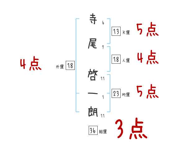 総運![]() | 寺尾啓一朗さんの総運は36画の3つ星!先見性が豊かです。多少神経質で苦労することも。 あなたの人生を表す1番重要な運勢です。生涯を通じて影響する総合運となり、主に50歳以降の晩年期に影響を及ぼします。 |