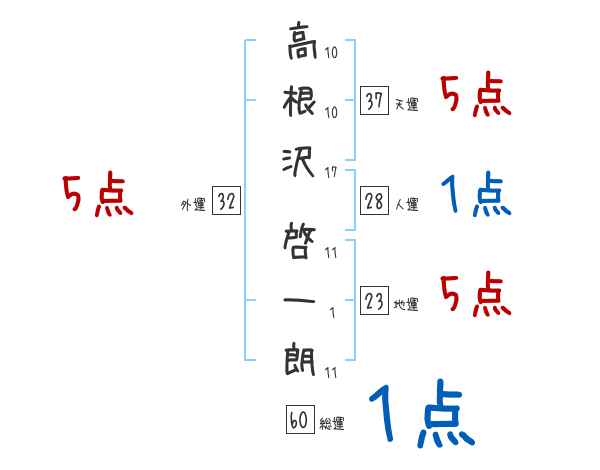 外運![]() | 高根沢啓一朗さんの外運は32画の5つ星!柔軟性があり成功する。チャンスが多く金運が良い。 生活面を象徴する運勢です。外部から受ける影響力を表し、結婚運、家庭運や職場、環境への順応性を表します。 |