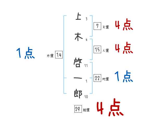 天運![]() | 上木啓一郎さんの天運は7画の4つ星!強い意志や信念を持ち独立心が強い。自立する。 家系が持つ宿命的な運勢を表します。祖先から受け継いだ苗字ですので自分の力が及びません。家柄を象徴します。 |