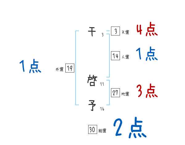 天運![]() | 千啓予さんの天運は3画の4つ星!活動的で才能に恵まれ、多くの信頼を得る。希望に満ち成長する。 家系が持つ宿命的な運勢を表します。祖先から受け継いだ苗字ですので自分の力が及びません。家柄を象徴します。 |