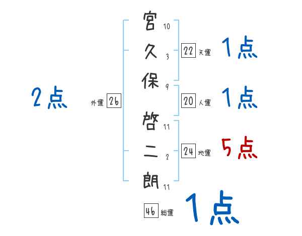 外運![]() | 宮久保啓二朗さんの外運は26画の2つ星!波瀾万丈かも。信頼できる人を大事にしましょう。 生活面を象徴する運勢です。外部から受ける影響力を表し、結婚運、家庭運や職場、環境への順応性を表します。 |