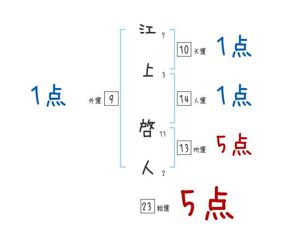 総運![]() | 江上啓人さんの総運は23画の5つ星!想像力に優れ活力がある。一代で成功し名誉を手に入れる。 あなたの人生を表す1番重要な運勢です。生涯を通じて影響する総合運となり、主に50歳以降の晩年期に影響を及ぼします。 |