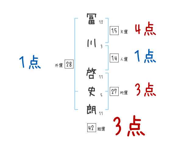 外運![]() | 冨川啓史朗さんの外運は28画の1つ星!家庭環境に注意。スポーツで活躍できる能力があるかも。 生活面を象徴する運勢です。外部から受ける影響力を表し、結婚運、家庭運や職場、環境への順応性を表します。 |