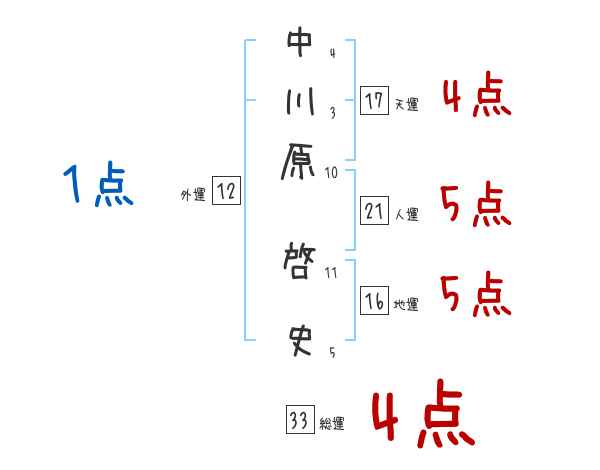 人運![]() | 中川原啓史さんの人運は21画の5つ星!統率力がある。独立し成功する。名誉を手に入れる。 性格や才能などを表す2番目に重要な運勢です。人間関係や協調性、社会的な成功に影響します。主に20歳から50歳ぐらいまでの中年期の運勢を表します。 |