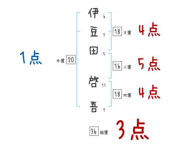 総運![]() | 伊豆田啓吾さんの総運は36画の3つ星!先見性が豊かです。多少神経質で苦労することも。 あなたの人生を表す1番重要な運勢です。生涯を通じて影響する総合運となり、主に50歳以降の晩年期に影響を及ぼします。 |
