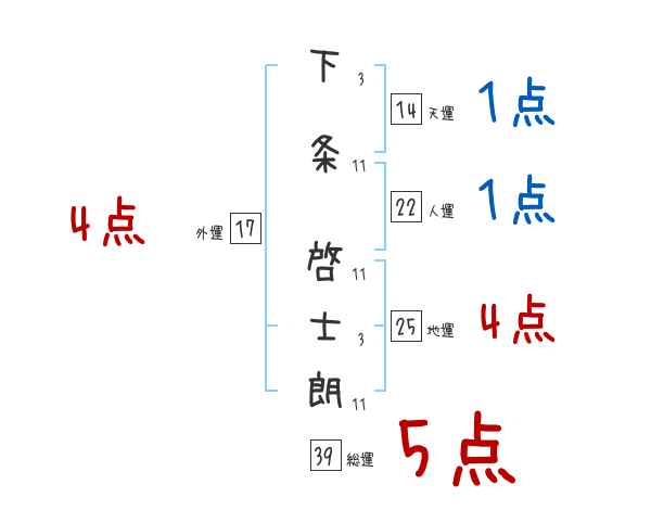外運![]() | 下条啓士朗さんの外運は17画の4つ星!積極的な行動力。地位を気づき財産を手に入れる。純粋な心と直感力。 生活面を象徴する運勢です。外部から受ける影響力を表し、結婚運、家庭運や職場、環境への順応性を表します。 |