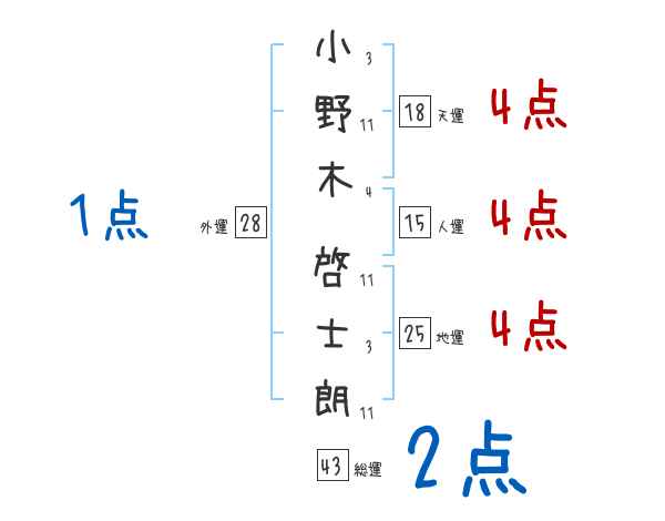 天運![]() | 小野木啓士朗さんの天運は18画の4つ星!情熱的で剛気。忍耐力があり信頼される。 家系が持つ宿命的な運勢を表します。祖先から受け継いだ苗字ですので自分の力が及びません。家柄を象徴します。 |
