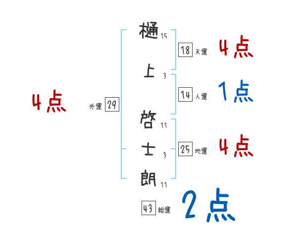 外運![]() | 樋上啓士朗さんの外運は29画の4つ星!完全主義で才能がある。厳格な心の持ち主。 生活面を象徴する運勢です。外部から受ける影響力を表し、結婚運、家庭運や職場、環境への順応性を表します。 |