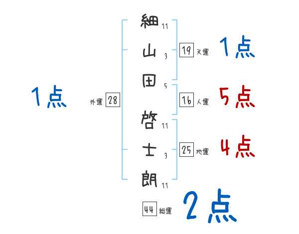 人運![]() | 細山田啓士朗さんの人運は16画の5つ星!人望が厚く大きく発展する。逆転成功が見える。 性格や才能などを表す2番目に重要な運勢です。人間関係や協調性、社会的な成功に影響します。主に20歳から50歳ぐらいまでの中年期の運勢を表します。 |