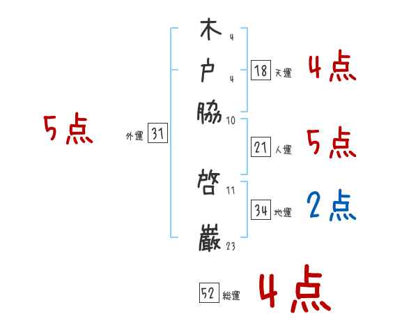 天運![]() | 木戸脇啓巌さんの天運は18画の4つ星!情熱的で剛気。忍耐力があり信頼される。 家系が持つ宿命的な運勢を表します。祖先から受け継いだ苗字ですので自分の力が及びません。家柄を象徴します。 |