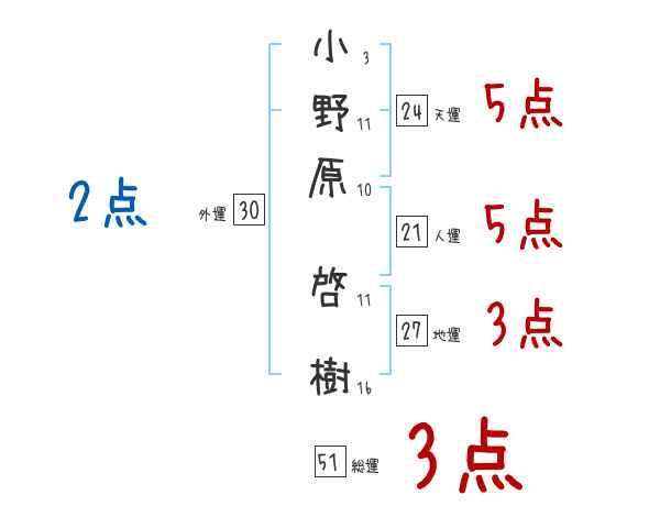 人運![]() | 小野原啓樹さんの人運は21画の5つ星!統率力がある。独立し成功する。名誉を手に入れる。 性格や才能などを表す2番目に重要な運勢です。人間関係や協調性、社会的な成功に影響します。主に20歳から50歳ぐらいまでの中年期の運勢を表します。 |
