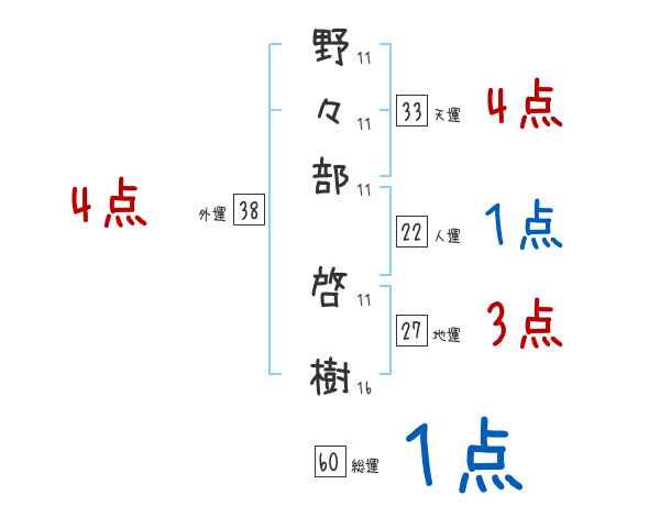 天運![]() | 野々部啓樹さんの天運は33画の4つ星!権力志向でプライドが高い。勇気があり運を切り開き成功する。 家系が持つ宿命的な運勢を表します。祖先から受け継いだ苗字ですので自分の力が及びません。家柄を象徴します。 |