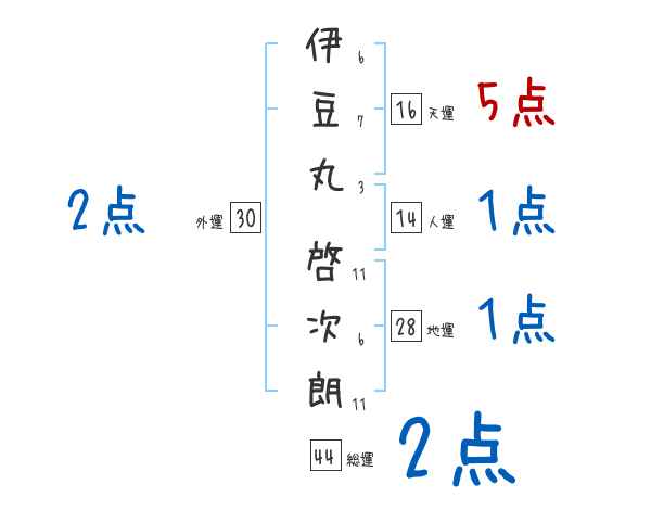 総運![]() | 伊豆丸啓次朗さんの総運は44画の2つ星!誠実で慎重な性格。物事を考えすぎないように注意しましょう。 あなたの人生を表す1番重要な運勢です。生涯を通じて影響する総合運となり、主に50歳以降の晩年期に影響を及ぼします。 |