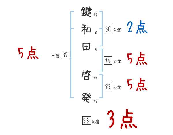 総運![]() | 鍵和田啓発さんの総運は53画の3つ星!やや見栄っ張りで虚栄心がある。散財に注意。 あなたの人生を表す1番重要な運勢です。生涯を通じて影響する総合運となり、主に50歳以降の晩年期に影響を及ぼします。 |