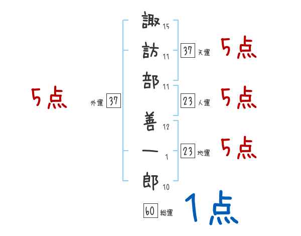 総運![]() | 諏訪部善一郎さんの総運は60画の1つ星!悲観的で迷いやすい。波乱が多く損をしないように。 あなたの人生を表す1番重要な運勢です。生涯を通じて影響する総合運となり、主に50歳以降の晩年期に影響を及ぼします。 |