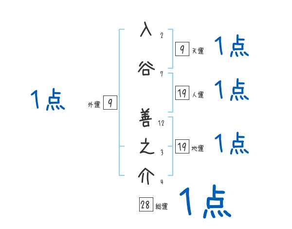 総運![]() | 入谷善之介さんの総運は28画の1つ星!家庭環境に注意。スポーツで活躍できる能力があるかも。 あなたの人生を表す1番重要な運勢です。生涯を通じて影響する総合運となり、主に50歳以降の晩年期に影響を及ぼします。 |
