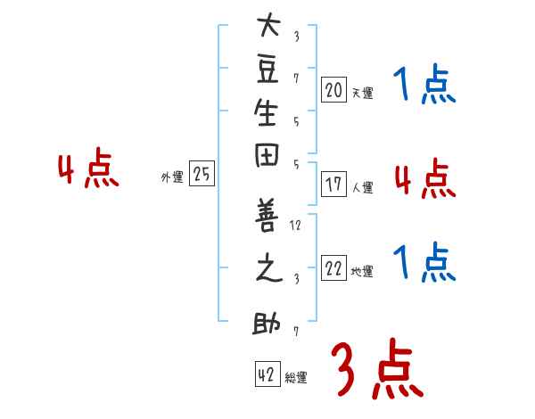 総運![]() | 大豆生田善之助さんの総運は42画の3つ星!病気に注意。多芸であるが消極的でおとなしい。 あなたの人生を表す1番重要な運勢です。生涯を通じて影響する総合運となり、主に50歳以降の晩年期に影響を及ぼします。 |