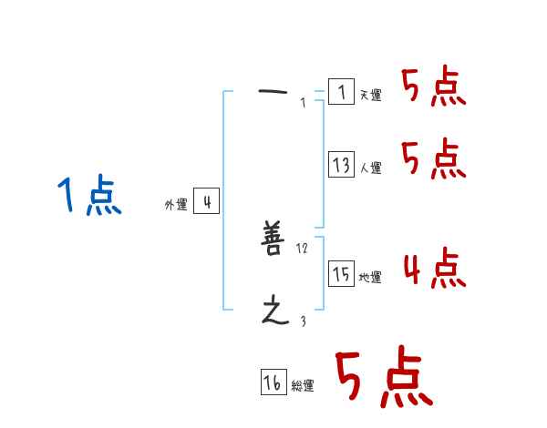天運![]() | 一善之さんの天運は1画の5つ星!行動力、指導力があり出世し繁栄する。幸運に恵まれる。 家系が持つ宿命的な運勢を表します。祖先から受け継いだ苗字ですので自分の力が及びません。家柄を象徴します。 |