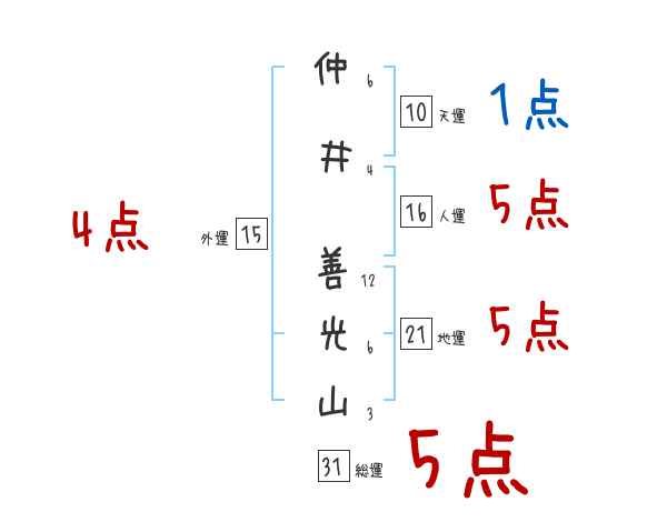 人運![]() | 仲井善光山さんの人運は16画の5つ星!人望が厚く大きく発展する。逆転成功が見える。 性格や才能などを表す2番目に重要な運勢です。人間関係や協調性、社会的な成功に影響します。主に20歳から50歳ぐらいまでの中年期の運勢を表します。 |