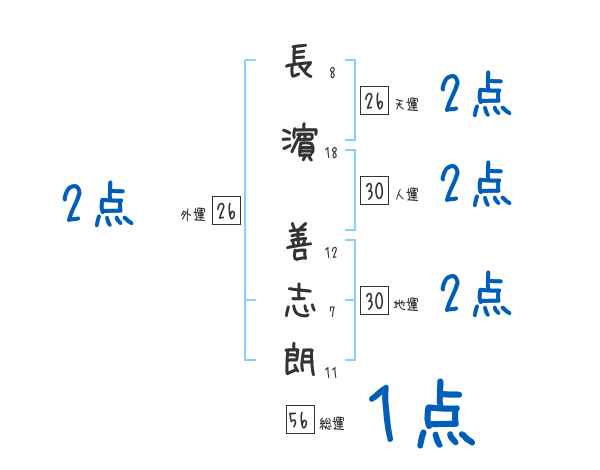 外運![]() | 長濵善志朗さんの外運は26画の2つ星!波瀾万丈かも。信頼できる人を大事にしましょう。 生活面を象徴する運勢です。外部から受ける影響力を表し、結婚運、家庭運や職場、環境への順応性を表します。 |