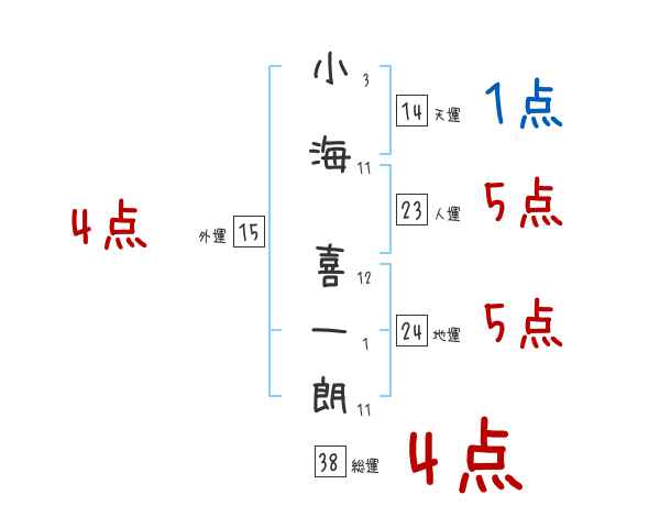 天運![]() | 小海喜一朗さんの天運は14画の1つ星!人に対して優しいがストレスを溜め込みがち。人間関係のトラブルを避けるよう気をつけましょう。 家系が持つ宿命的な運勢を表します。祖先から受け継いだ苗字ですので自分の力が及びません。家柄を象徴します。 |