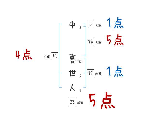天運![]() | 中喜世人さんの天運は4画の1つ星!感情が不安定で苦労するかも。周囲との協調を心掛けましょう。 家系が持つ宿命的な運勢を表します。祖先から受け継いだ苗字ですので自分の力が及びません。家柄を象徴します。 |