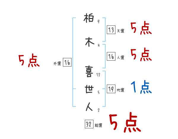 総運![]() | 柏木喜世人さんの総運は32画の5つ星!柔軟性があり成功する。チャンスが多く金運が良い。 あなたの人生を表す1番重要な運勢です。生涯を通じて影響する総合運となり、主に50歳以降の晩年期に影響を及ぼします。 |