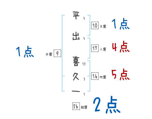 天運![]() | 平出喜久一さんの天運は10画の1つ星!不安を感じやすい傾向。ストレスを抱えないように注意しましょう。 家系が持つ宿命的な運勢を表します。祖先から受け継いだ苗字ですので自分の力が及びません。家柄を象徴します。 |