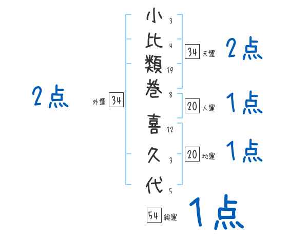 人運![]() | 小比類巻喜久代さんの人運は20画の1つ星!社交が苦手。人とは違った才能があり波乱万丈な人生かも。 性格や才能などを表す2番目に重要な運勢です。人間関係や協調性、社会的な成功に影響します。主に20歳から50歳ぐらいまでの中年期の運勢を表します。 |