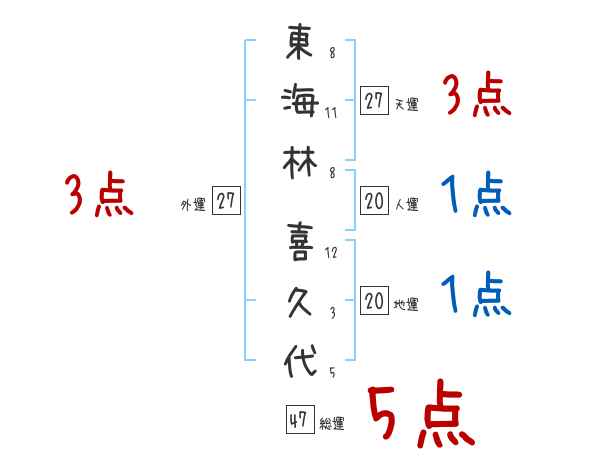 天運![]() | 東海林喜久代さんの天運は27画の3つ星!頭脳明晰だが強情で摩擦が多い傾向。孤立に注意。 家系が持つ宿命的な運勢を表します。祖先から受け継いだ苗字ですので自分の力が及びません。家柄を象徴します。 |