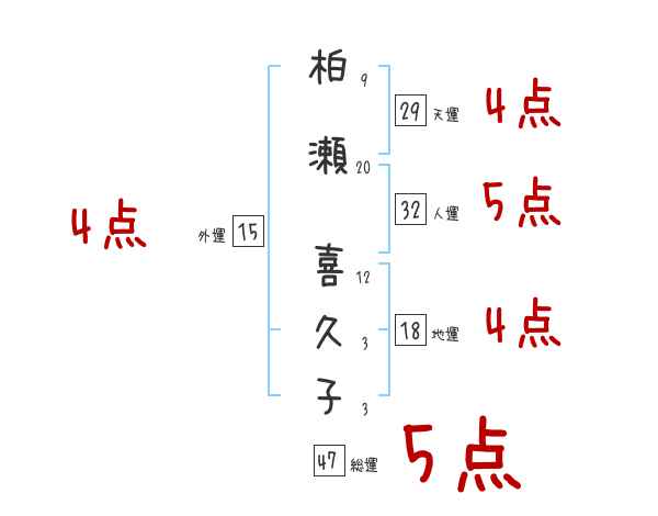 人運![]() | 柏瀬喜久子さんの人運は32画の5つ星!柔軟性があり成功する。チャンスが多く金運が良い。 性格や才能などを表す2番目に重要な運勢です。人間関係や協調性、社会的な成功に影響します。主に20歳から50歳ぐらいまでの中年期の運勢を表します。 |