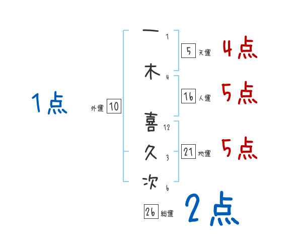 人運![]() | 一木喜久次さんの人運は16画の5つ星!人望が厚く大きく発展する。逆転成功が見える。 性格や才能などを表す2番目に重要な運勢です。人間関係や協調性、社会的な成功に影響します。主に20歳から50歳ぐらいまでの中年期の運勢を表します。 |