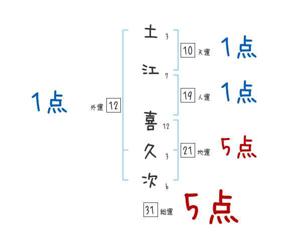 天運![]() | 土江喜久次さんの天運は10画の1つ星!不安を感じやすい傾向。ストレスを抱えないように注意しましょう。 家系が持つ宿命的な運勢を表します。祖先から受け継いだ苗字ですので自分の力が及びません。家柄を象徴します。 |