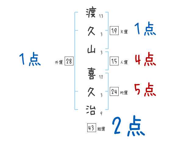 総運![]() | 渡久山喜久治さんの総運は43画の2つ星!頑固な性格で独立心が強いかも。やや非現実的で浪費に注意しましょう。 あなたの人生を表す1番重要な運勢です。生涯を通じて影響する総合運となり、主に50歳以降の晩年期に影響を及ぼします。 |