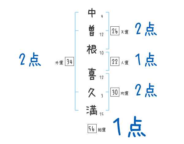 総運![]() | 中曽根喜久満さんの総運は56画の1つ星!消極的で無気力になりがち。誠実な気持ちが必要でしょう。 あなたの人生を表す1番重要な運勢です。生涯を通じて影響する総合運となり、主に50歳以降の晩年期に影響を及ぼします。 |
