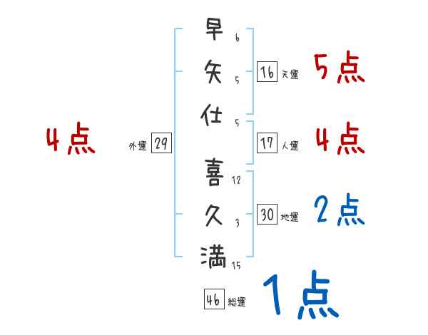天運![]() | 早矢仕喜久満さんの天運は16画の5つ星!人望が厚く大きく発展する。逆転成功が見える。 家系が持つ宿命的な運勢を表します。祖先から受け継いだ苗字ですので自分の力が及びません。家柄を象徴します。 |