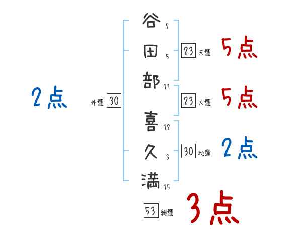 天運![]() | 谷田部喜久満さんの天運は23画の5つ星!想像力に優れ活力がある。一代で成功し名誉を手に入れる。 家系が持つ宿命的な運勢を表します。祖先から受け継いだ苗字ですので自分の力が及びません。家柄を象徴します。 |