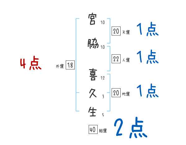 人運![]() | 宮脇喜久生さんの人運は22画の1つ星!努力することが苦手ないっぽう手先が器用。芸術性にも優れる。 性格や才能などを表す2番目に重要な運勢です。人間関係や協調性、社会的な成功に影響します。主に20歳から50歳ぐらいまでの中年期の運勢を表します。 |