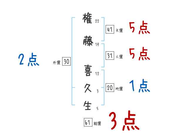 | 外運  | 権藤喜久生さんの外運は30画の2つ星!浮き沈みの激しさに注意しましょう。生活面を象徴する運勢です。外部から受ける影響力を表し、結婚運、家庭運や職場、環境への順応性を表します。 |