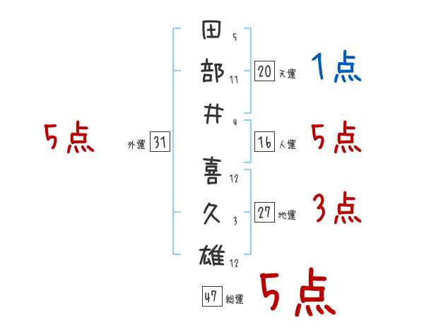 総運![]() | 田部井喜久雄さんの総運は47画の5つ星!実力が開花し発展する円満な人生。財に恵まれる。 あなたの人生を表す1番重要な運勢です。生涯を通じて影響する総合運となり、主に50歳以降の晩年期に影響を及ぼします。 |