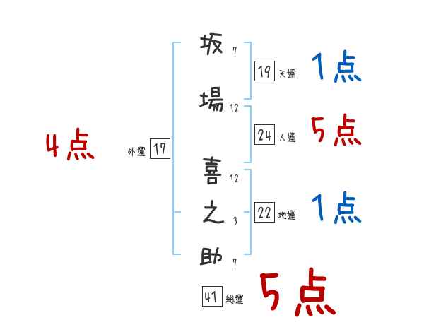 天運![]() | 坂場喜之助さんの天運は19画の1つ星!優れた才能を持ちますが、協調性が足りないことも。周りの人と協力する事を意識しましょう。 家系が持つ宿命的な運勢を表します。祖先から受け継いだ苗字ですので自分の力が及びません。家柄を象徴します。 |