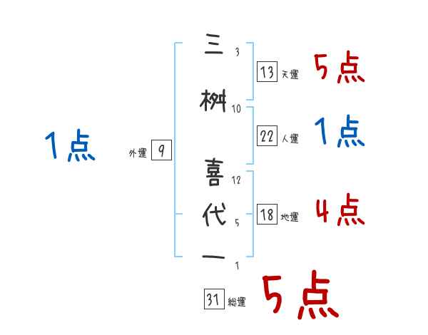 天運![]() | 三桝喜代一さんの天運は13画の5つ星!才能に恵まれ人気がある。名声を手に入れる。円満な人生。 家系が持つ宿命的な運勢を表します。祖先から受け継いだ苗字ですので自分の力が及びません。家柄を象徴します。 |