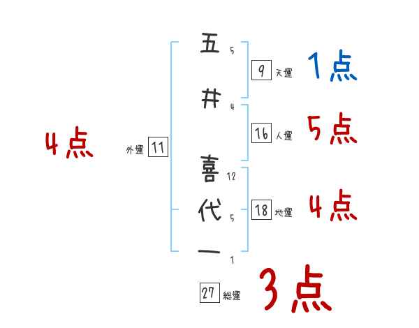 人運![]() | 五井喜代一さんの人運は16画の5つ星!人望が厚く大きく発展する。逆転成功が見える。 性格や才能などを表す2番目に重要な運勢です。人間関係や協調性、社会的な成功に影響します。主に20歳から50歳ぐらいまでの中年期の運勢を表します。 |