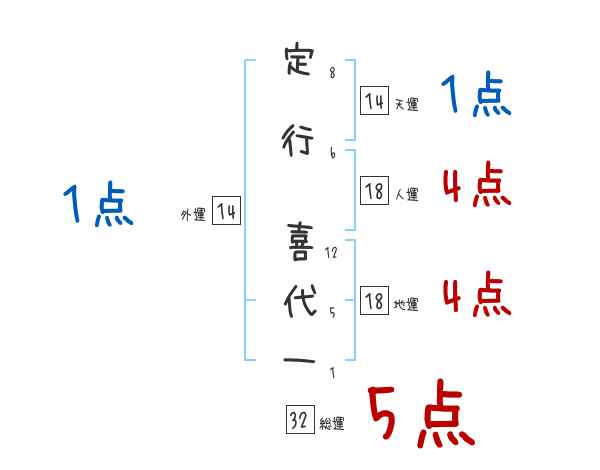 外運![]() | 定行喜代一さんの外運は14画の1つ星!人に対して優しいがストレスを溜め込みがち。人間関係のトラブルを避けるよう気をつけましょう。 生活面を象徴する運勢です。外部から受ける影響力を表し、結婚運、家庭運や職場、環境への順応性を表します。 |